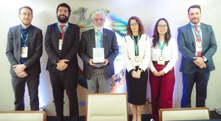 Durante o evento foram homenageados pela sua relevante atuação no PBH, Magna Luduvice, analista ambiental aposentada, que esteve por 17 anos à frente da Unidade Nacional de Ozônio (NOU, sigla em inglês), e Miguel Quintero, ex-consultor internacional do PBH que atuou na elaboração e implementação do projeto para o setor de espumas no Brasil entre 2011 e 2022 (na foto acima, Magna Luduvice e Miquel Quintero com Érico Rocha e a equipe do MMA, os analistas Frank Amorim, Gabriela Lira e Tatiana Oliveira; e Stefanie von Heinemann, consultora e gerente de projetos da GIZ).